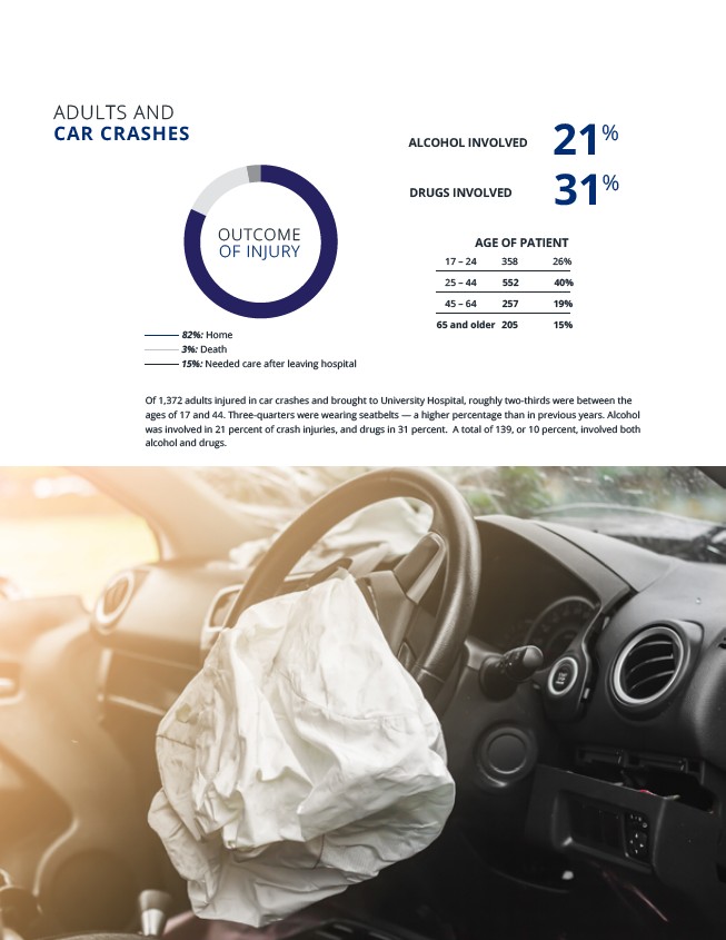 Of 1,372 adults injured in car crashes and brought to University Hospital, roughly two-thirds were between the ages of 17 and 44. Three-quarters were wearing seatbelts — a higher percentage than in previous years. Alcohol was involved in 21 percent of crash injuries, and drugs in 31 percent. A total of 139, or 10 percent, involved both alcohol and drugs.