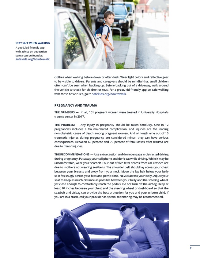 clothes when walking before dawn or after dusk. Wear light colors and reflective gear to be visible to drivers. Parents and caregivers should be mindful that small children often can’t be seen when backing up. Before backing out of a driveway, walk around